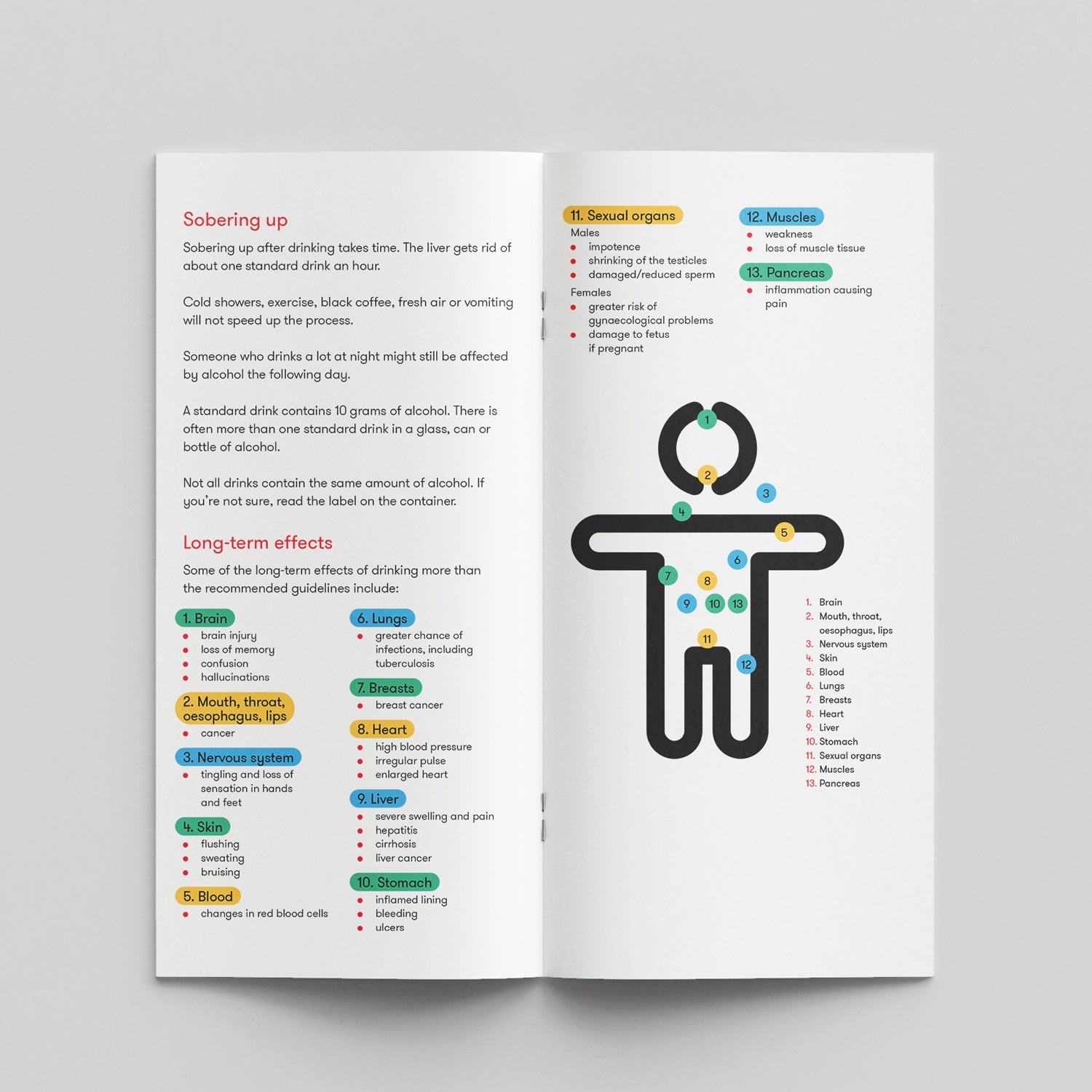 The pamphlet includes updated statistics on alcohol use in Australia, and information on: